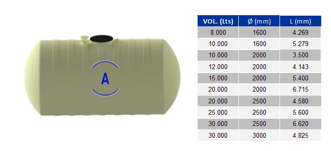 Son depósitos de enterrar (siendo necesario especificar el tipo de instalación para los modelos requeridos) fabricados en PRFV especialmente diseñados para almacenar volúmenes de agua desde 8.000 hasta 30.000 litros.