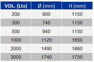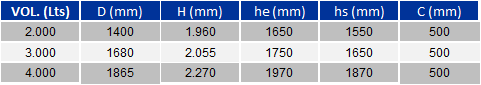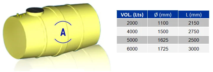 Son depósitos de enterrar (siendo necesario especificar el tipo de instalación para los modelos requeridos) fabricados en PRFV especialmente diseñados para almacenar volúmenes de agua desde 2.000 hasta 6.000 litros.